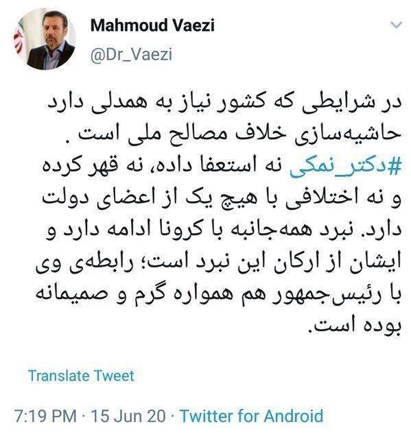 رییس دفتر رییس جمهور: وزیر بهداشت اختلافی با هیچ یک از اعضای دولت ندارد
