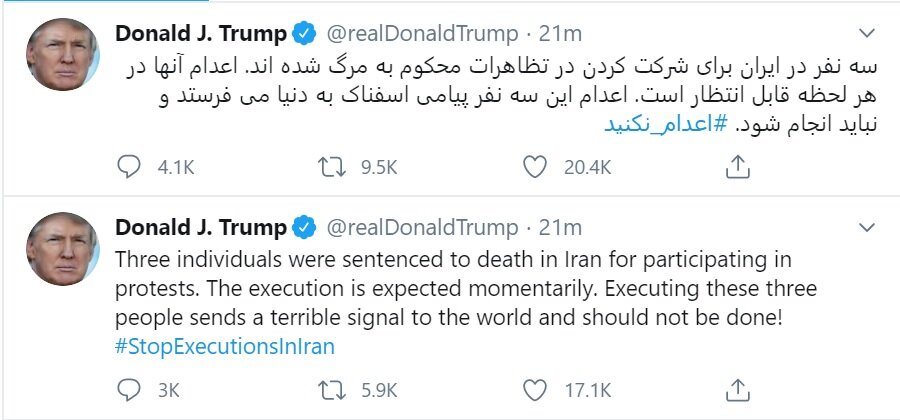 از این رو،  ترامپ را باید منتظرترین فرد برای اعدام این سه نفر دانست تا بعد از اعدام احتمالی، در حالی که لبخند می زند، قسمت های بعدی سریال توئیت های فارسی اش را به مرثیه سرایی برای آنها اختصاص دهد.