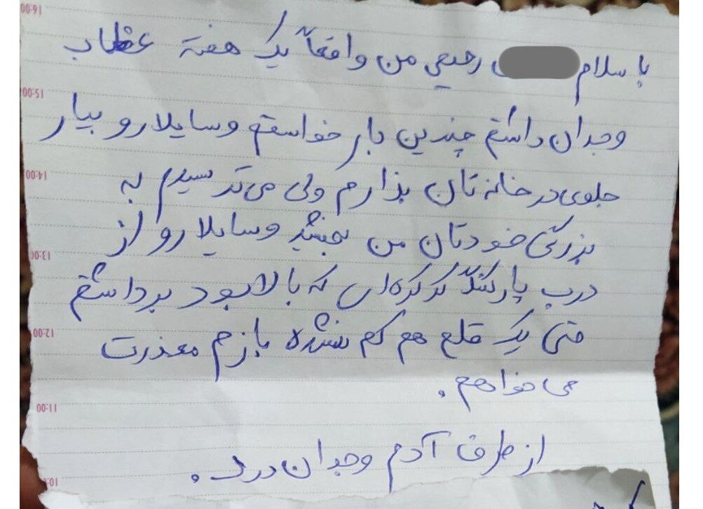 یک سارق در بجنورد خراسان شمالی پس از انجام سرقت، گرفتار نیروی وجدان خود شده و با بازگرداندن اموال مسروقه به مالباخته، در نامهای از کار خود ابزار پشیمانی کرد.