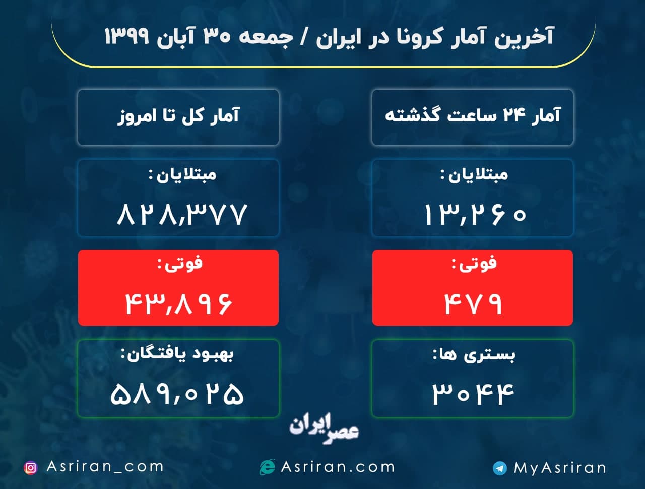 آخرین آمار کرونا در ایران/ جمعه 30 آبان 1399 (اینفوگرافیک)