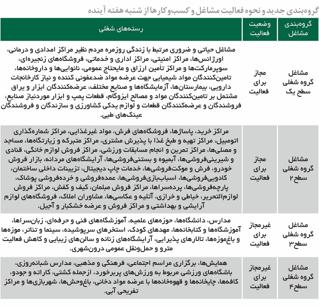به گفته «فرهانی» اصناف مجاز، طی هفته پیشرو از ساعت ٨ تا ۲۰ فعالیت میکنند و ممنوعیت عبور و مرور همچون گذشته از ساعت ٢١ تا ٤ صبح روز بعد برقرار است.