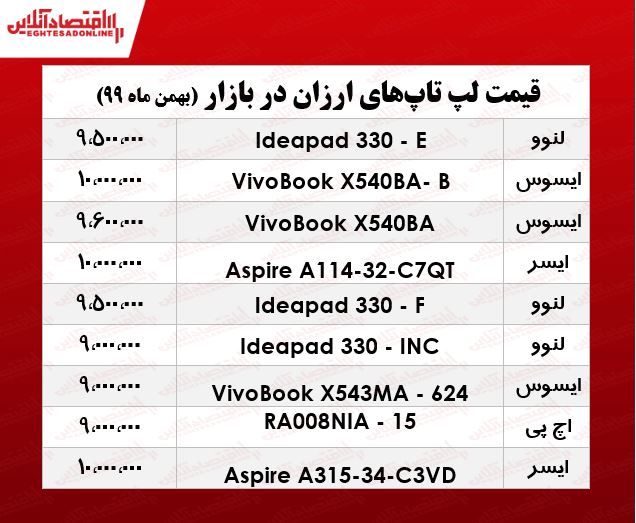 آنچه در زیر می آید ارزان‌ترین لپ تاپ‌های موجود در سطح بازار تهران است.