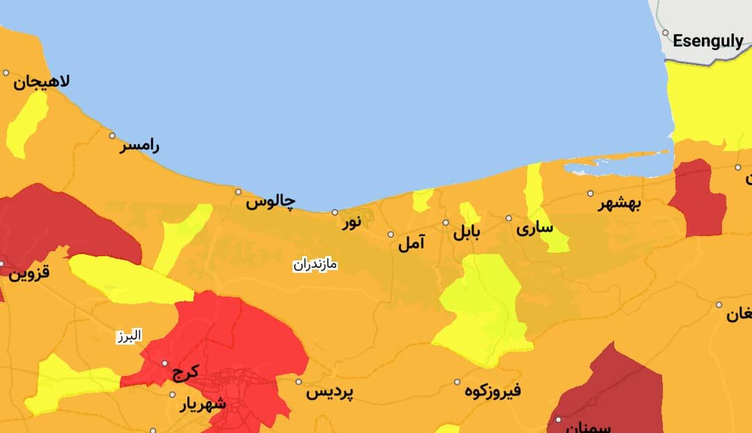 همچنین شهرستان های میاندرود، کلاردشت، بابلسر، سیمرغ ، سوادکوه شمالی و سوادکوه جنوبی در رنگ بندی زرد قرار گرفته اند.