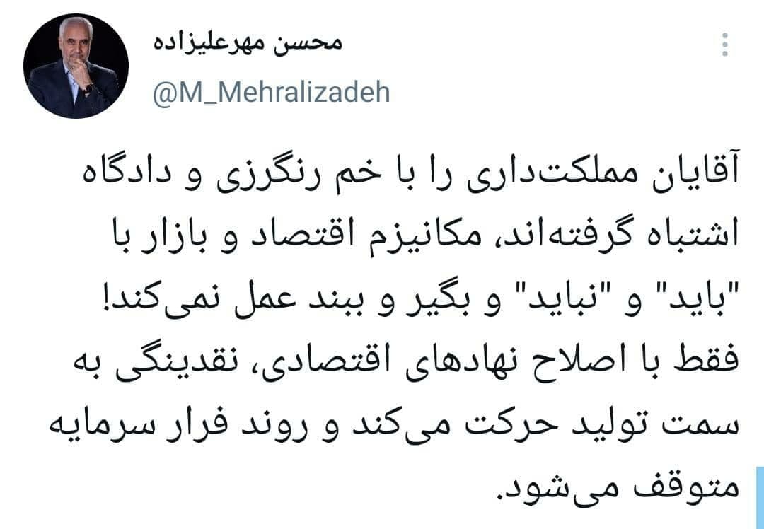 محسن مهرعلیزاده نامزد سیزدهمین دوره انتخابات ریاست جمهوری در حساب کاربری خود در توییتر نوشت:«آقایان مملکت داری را با خم رنگرزی و دادگاه اشتباه گرفته اند مکانیزم اقتصاد و بازار با باید و نباید و بگیر و ببند عمل نمی کند».