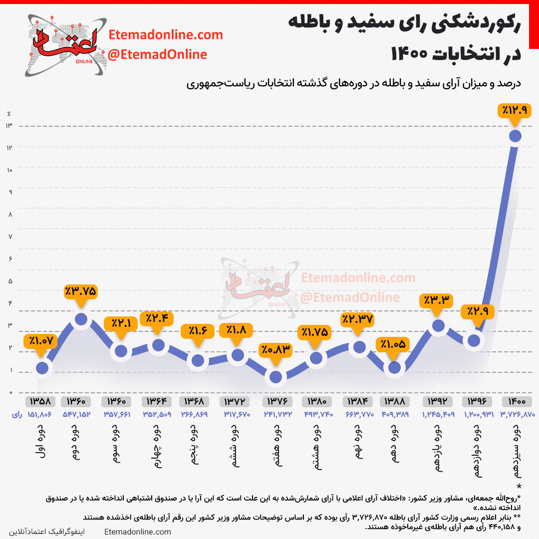 عصر ایران، سجادبهزادی- نزديك به ۴ميليون ويا به عبارتي ۱۳ درصد كل آراء ريخته شده به صندوق انتخابات رياست جمهوري ۱۴۰۰ آراء باطله بوده واين موضوع توجه محافل بسياري در داخل وخارج از كشور را به خود جلب کرده است*.