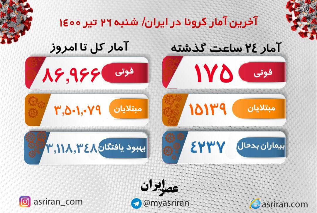 آخرین آمار کرونا در کشور، شنبه ۲۶ تیر (اینفوگرافیک)