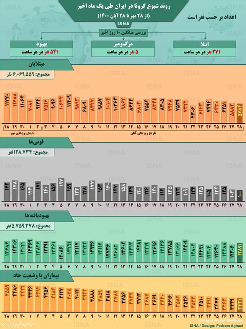 بررسی آمارهای وزارت بهداشت نشان میدهد که طی ۱۰ روز اخیر (۱۹ تا ۲۸ آبان ۱۴۰۰) به طور متوسط هر ساعت ۲۷۱ نفر در ایران مبتلا و ۵ نفر قربانی کرونا شدهاند و در هر ساعت ۵۴۱ نفر نیز بهبود یافتهاند.