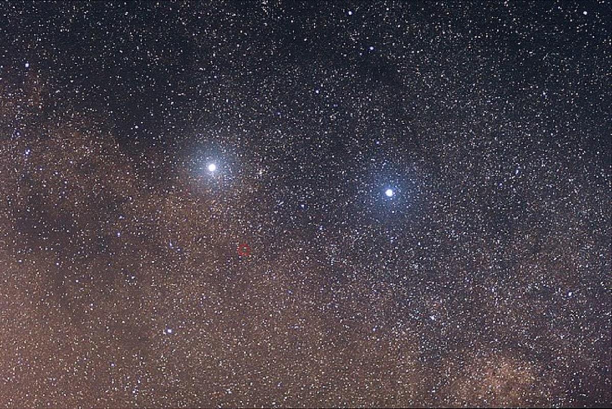 پروکسیما قنطورس، نزدیک‌ترین ستاره به خورشید است و در فاصله ۴.۲ سال نوری از ما قرار دارد (داخل دایره) در کنار درخشش دو ستاره‌ی خورشید مانند یعنی ستاره‌ی آلفا قنطورس A و B .