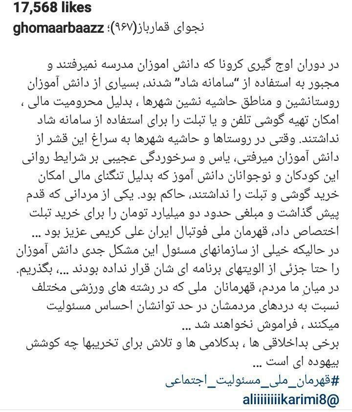 به گزارش خبرورزشی، رسول خادم به عنوان قهرمان، سرمربی و رییس فدراسیون سابق کشتی ضمن قهرمان ملی خواندن علی کریمی، پرده از کارهای خیر جادوگر فوتبال ایران برداشت و متنی را منتشر کرد که تصویر آن قابل مشاهده است.