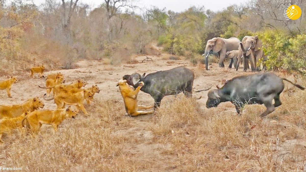 ببینید| دو گاومیش در چنگال ۲۲ شیر