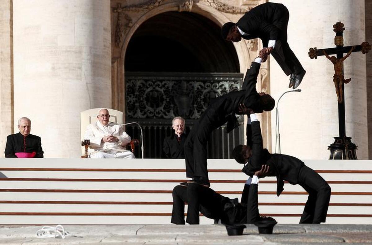 سیرک بازانی از کنیا در حال انجام حرکات نمایشی در مقابل پاپ فرانسیس در حاشیه جلسه موعظه هفتگی پاپ در واتیکان/ رویترز