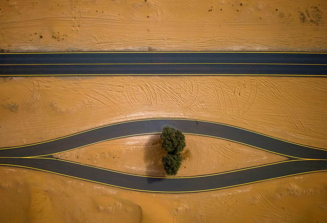عکاس اهل سویس «Paolo Nigris»، این عکس را در بیابانی در دبی گرفته؛ مسیر جاده را به خاطر حفظ یک درخت تغییر دادهاند. نتیجه، خلق چشم بزرگی است که مردمک آن درخت است! نوعی ادای احترام شاعرانه به طبیعت و سرزمین مادری.