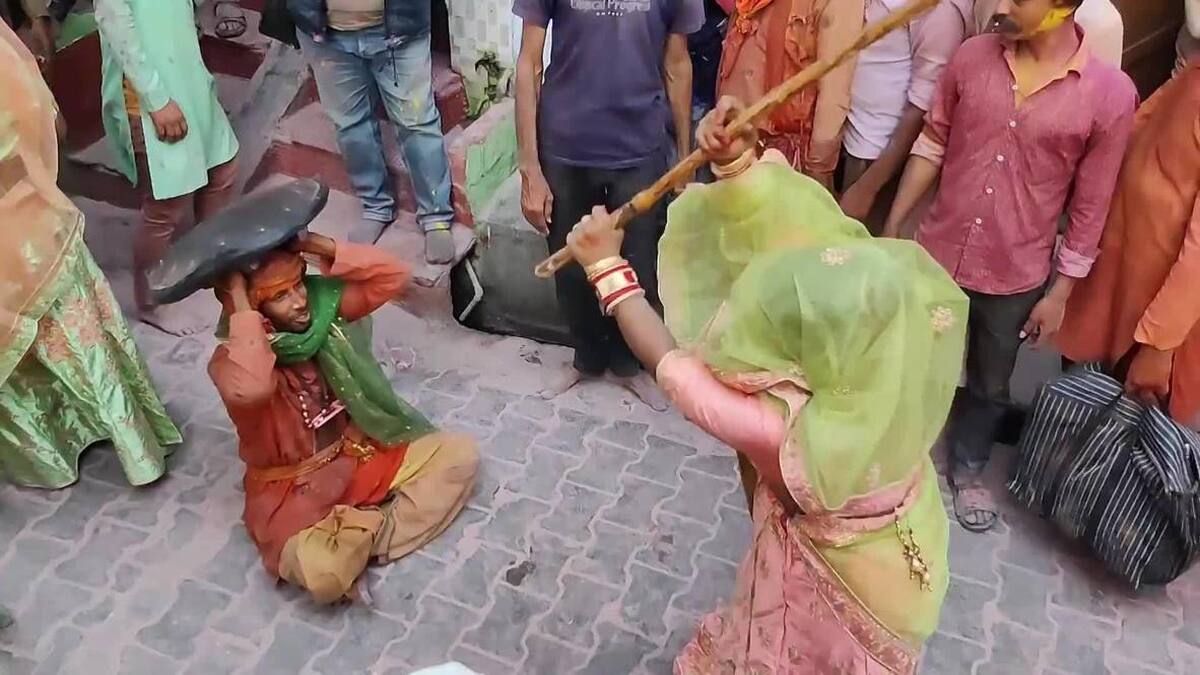 در بخشی از جشنواره "رنگ" هند، زنان مردان را با چوب میزنند.