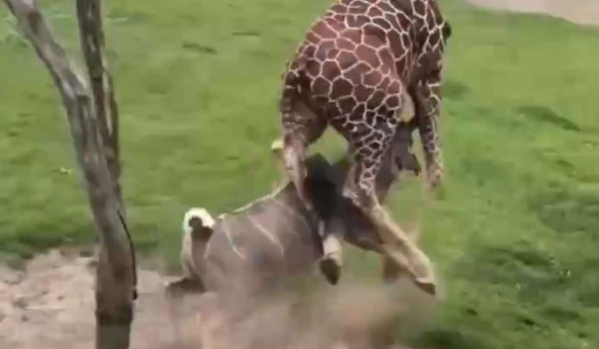 گوزن کودو، حیوان جنگجویی نیست، اما در این ویدئو میبینیم که به شکلی ناباورانه وارد نبرد با یک زرافه میشود و این حیوان ۶ متری را زمین میزند.