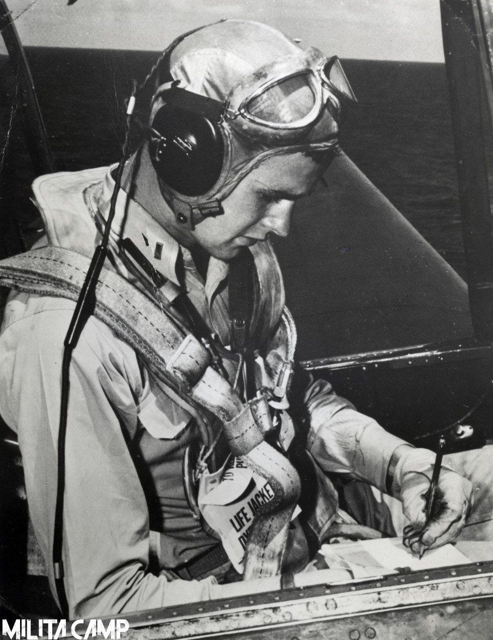 در این تصویر، چهل و یکمین رئیس جمهور ایالات متحده یعنی ستوان جورج بوش ۲۰ ساله در کابین یک جنگنده TBF Avenger متعلق به اسکادران VT-51 و بر روی عرشه ناو هواپیمابر USS San Jactino در حال نوشتن وصیت نامه خود در دفترچه خاطراتش است! / Milita_Camp