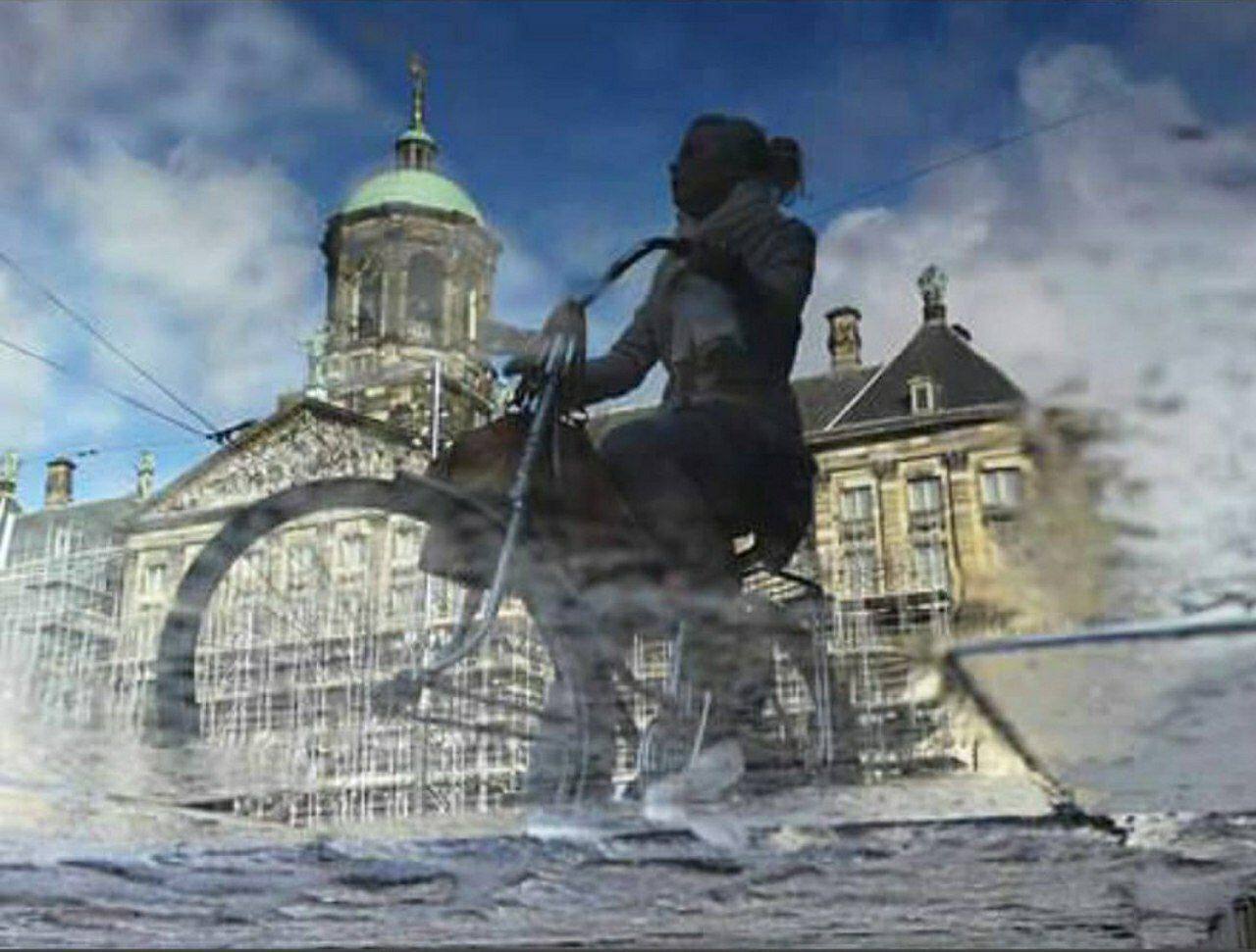 این تصویر با موبایل گرفته شده و هیچ ویرایش با فیلتری روی آن صورت نگرفته است. این عکس، از بازتاب تنصویر زنی دوچرخه سوار در گودال آبی مقابل کاخ سلطنتی در شهر آمستردام گرفته شده است.