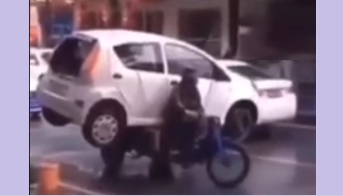 یک موتور سوار در اقدامی عجیب یک ماشین را برای جابه‌جایی در قسمت ترک موتور قرار داده است.
