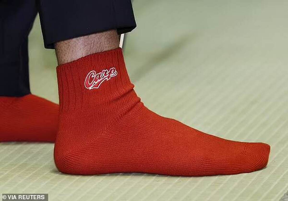 جوراب قرمز روشن نخست وزیر انگلیس با علامت تیم بیسبال Toyo Carp هیروشیما بود یعنی همان تیمی که نخست وزیر ژاپن هوادار آن است.