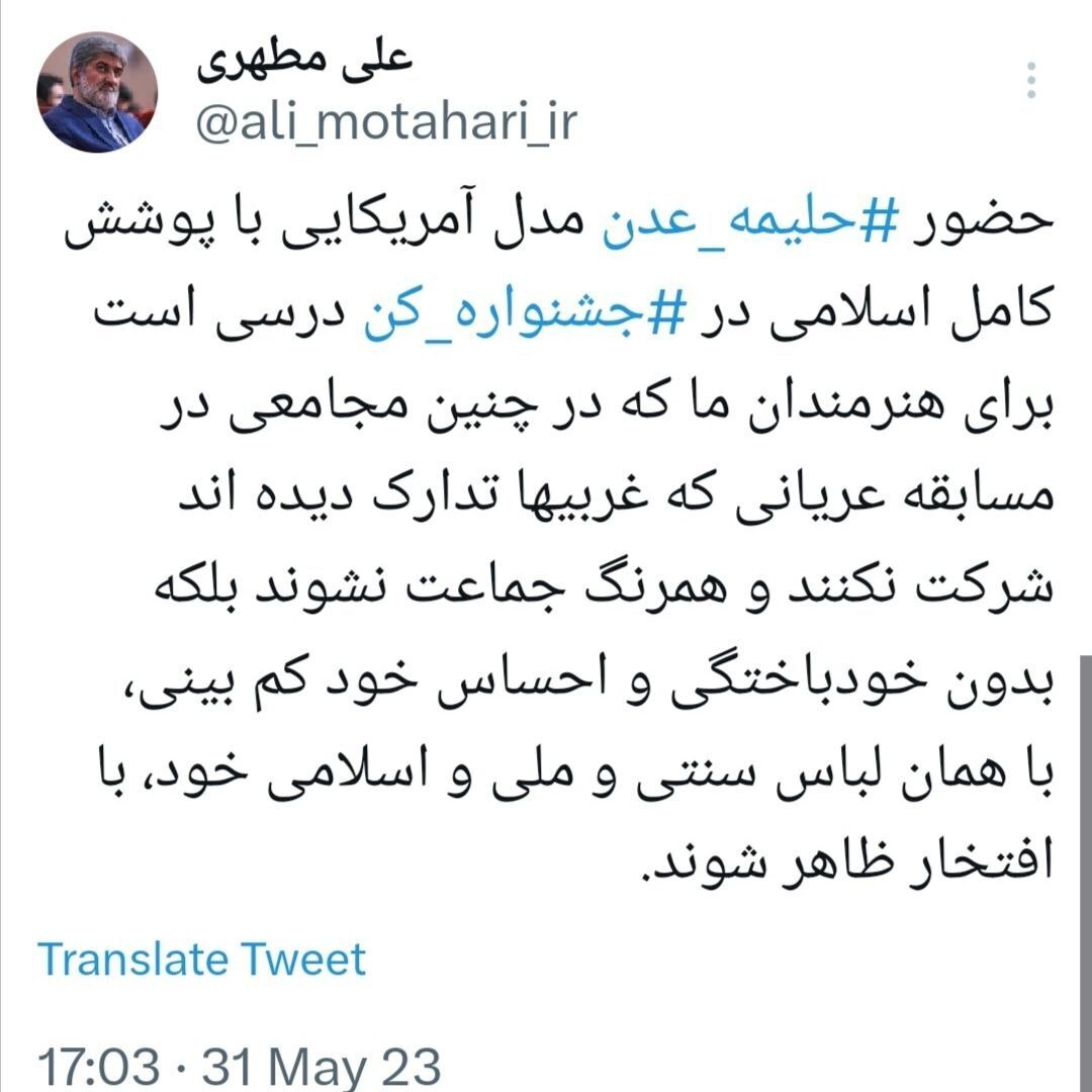 علی مطهری در توئیتی به حضور مدل آمریکایی با پوشش اسلامی در جشنواره کن واکنش نشان داد.