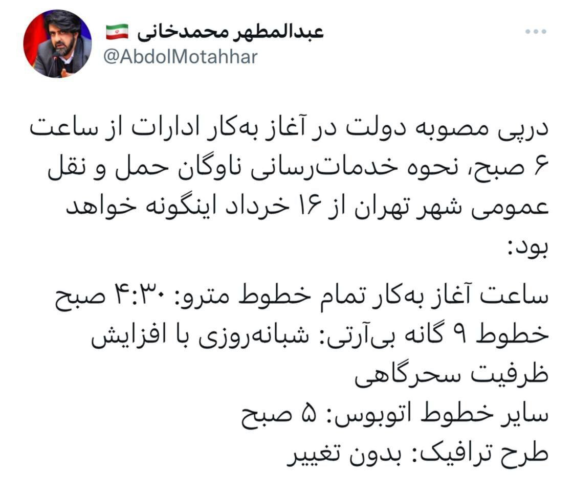 سخنگوی شهرداری تهران: با توجه به مصوبه دولت در تغییر ساعت ادارهها، تغییر ساعت خدماتدهی حمل و نقل عمومی در تهران اعلام شد.